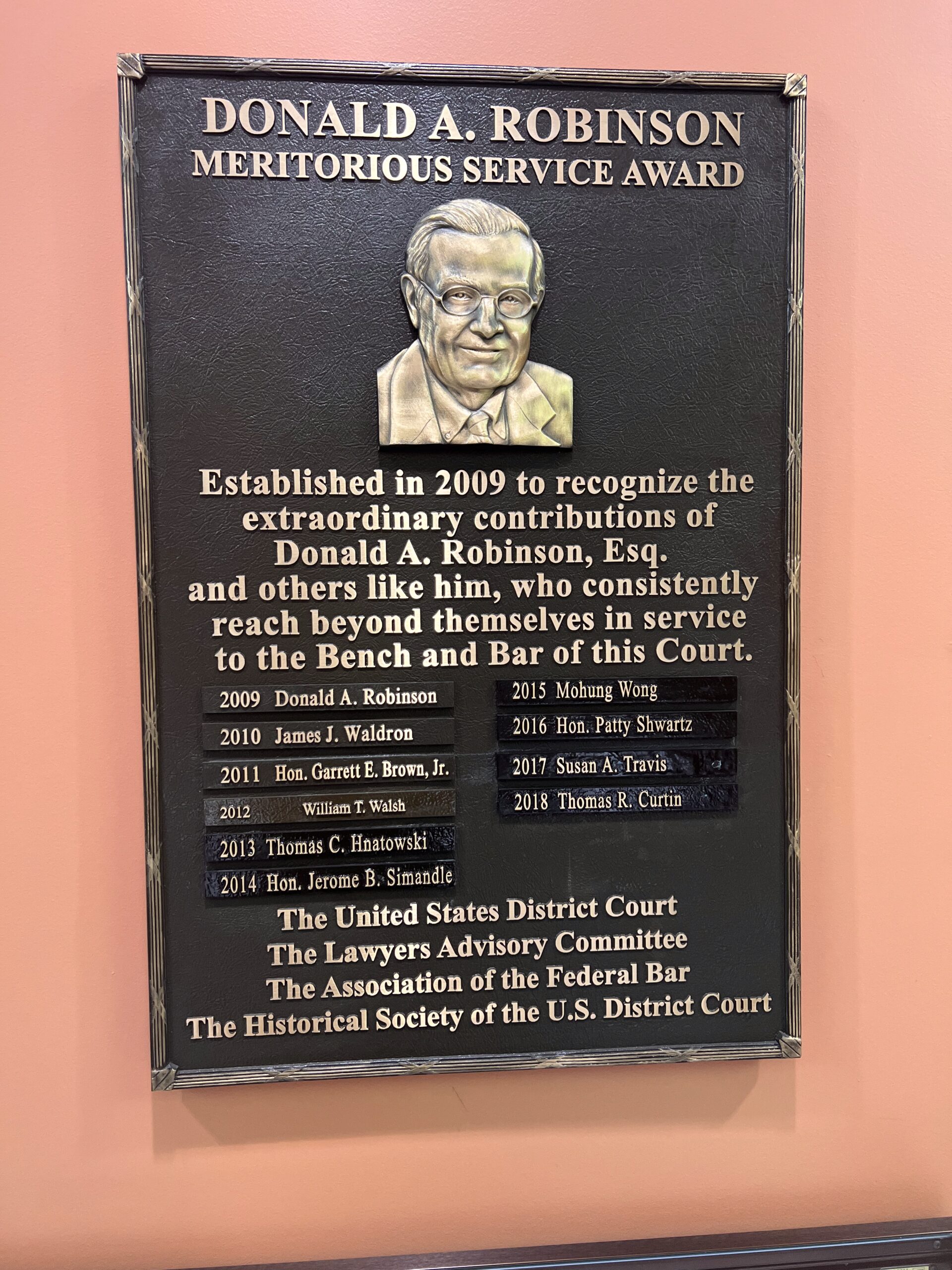 nassau-pba-bronze photo engraved Bronze plaque with a flat band border and oxidized color, Studs on back for mounting.