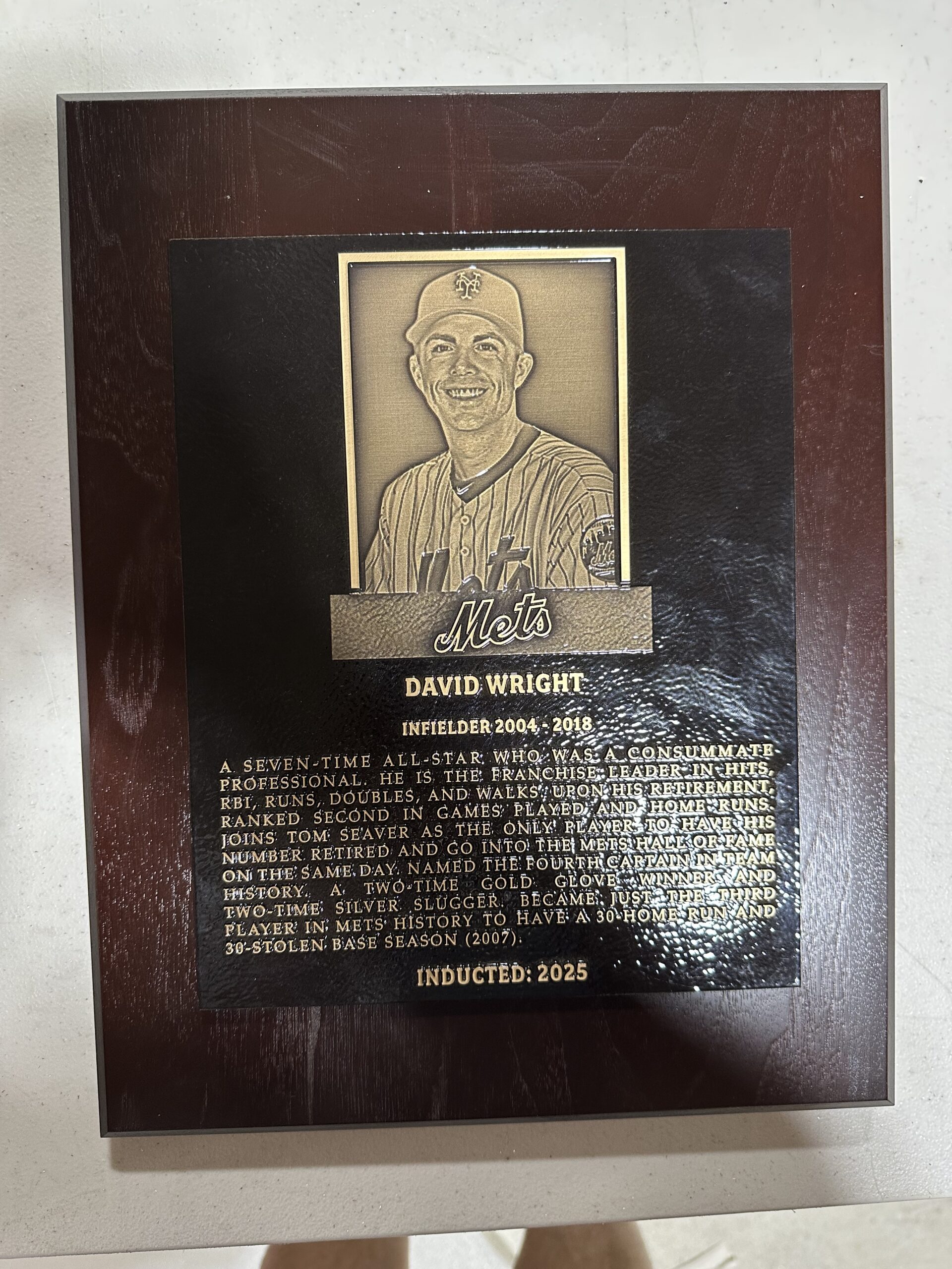 This classic bronze plaque serves as a timeless commemoration of Phillies infielder Granny Hamner. Featuring a meticulously crafted plaque of a face in metal, the facial details stand out against the textured background, highlighting his impressive career statistics and achievements.