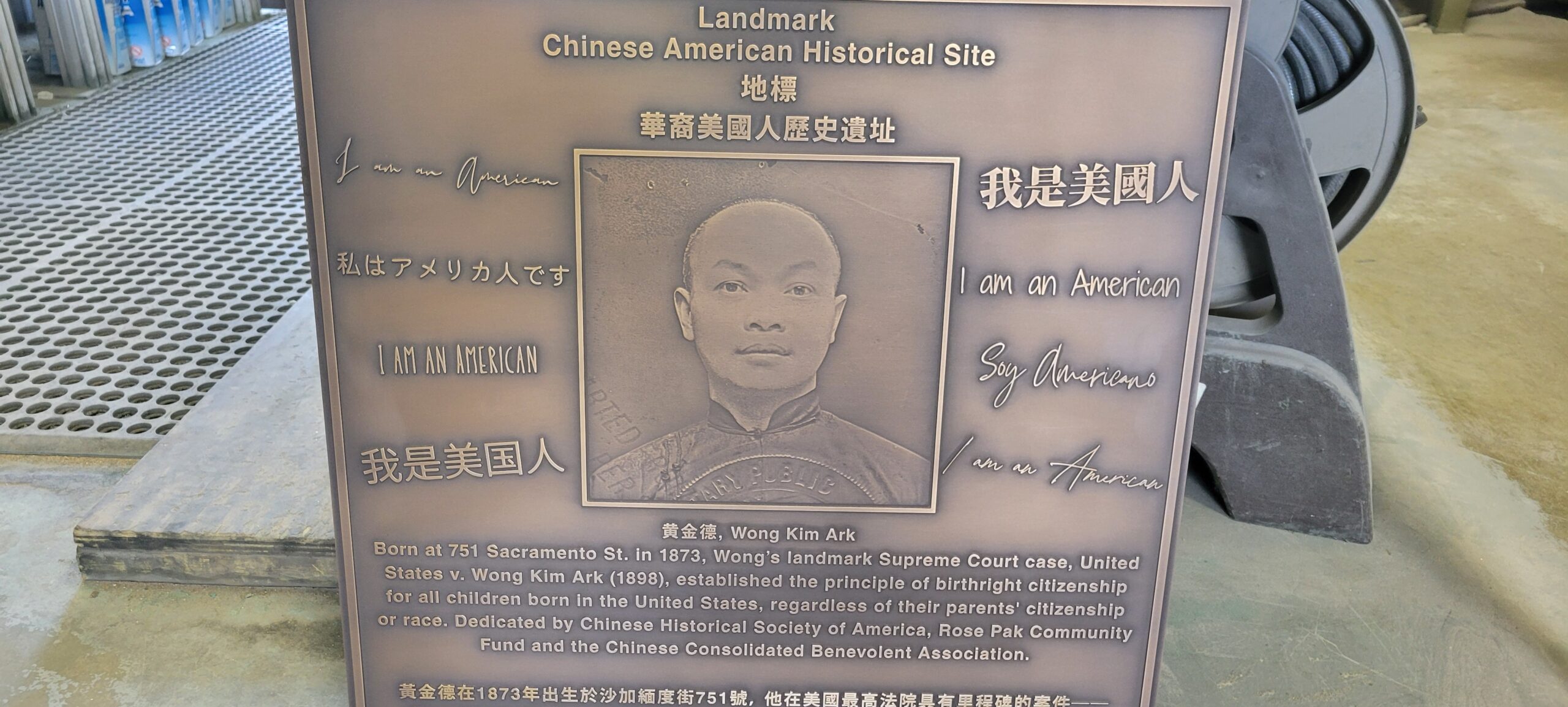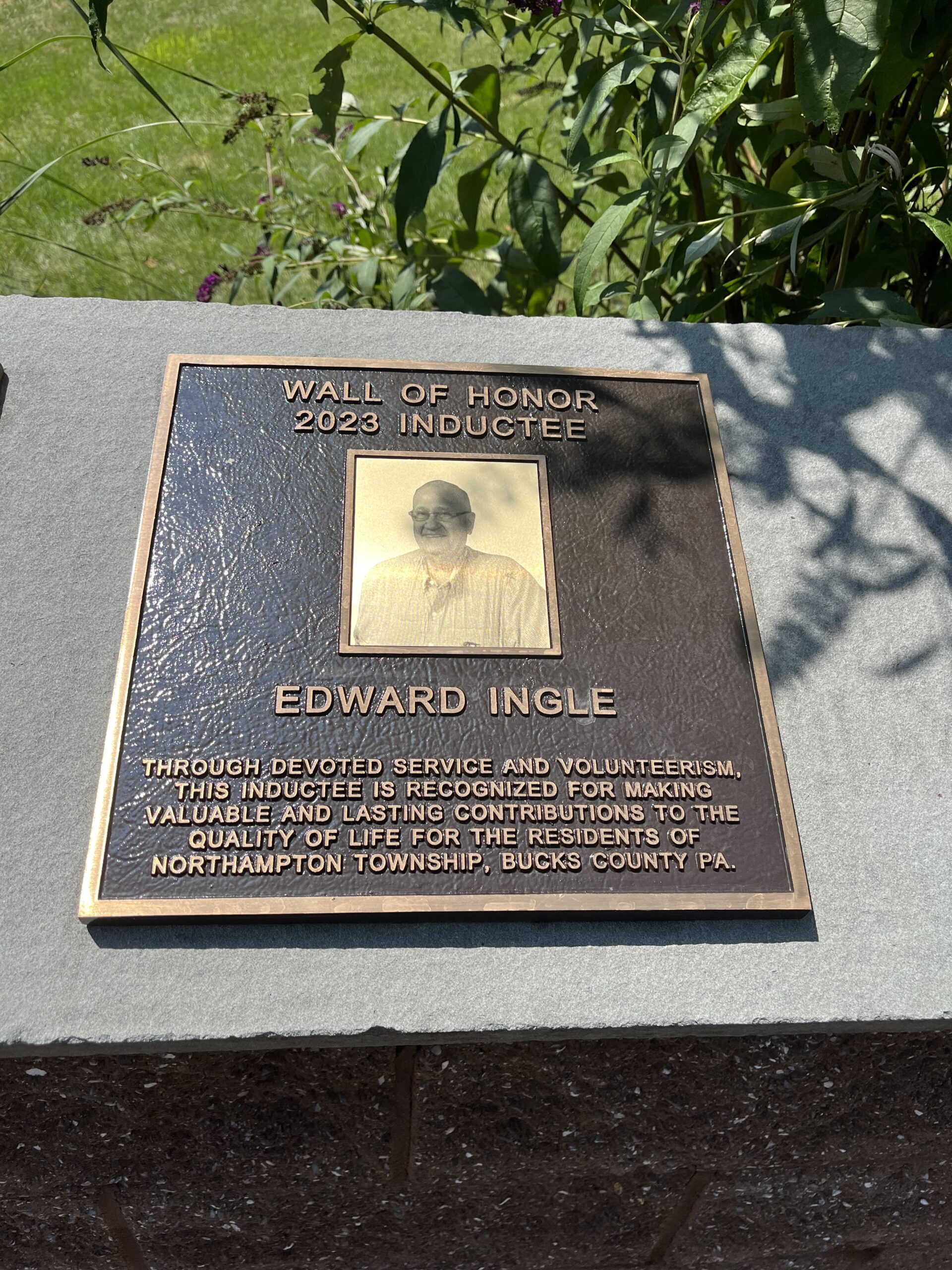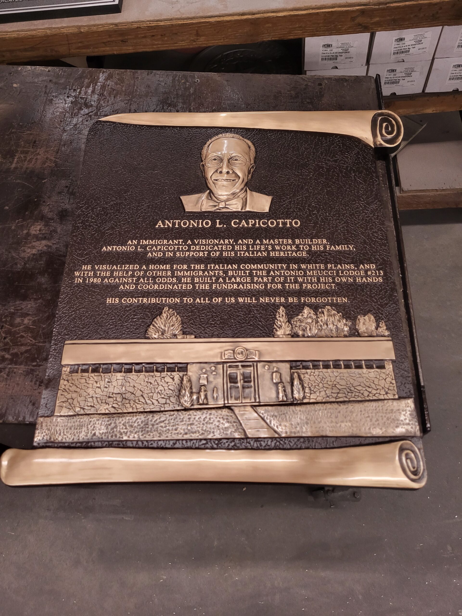 Photo #4 Etched oxidized bronze plaque with black recessed text. Bronze Bas-relief image bottom left.