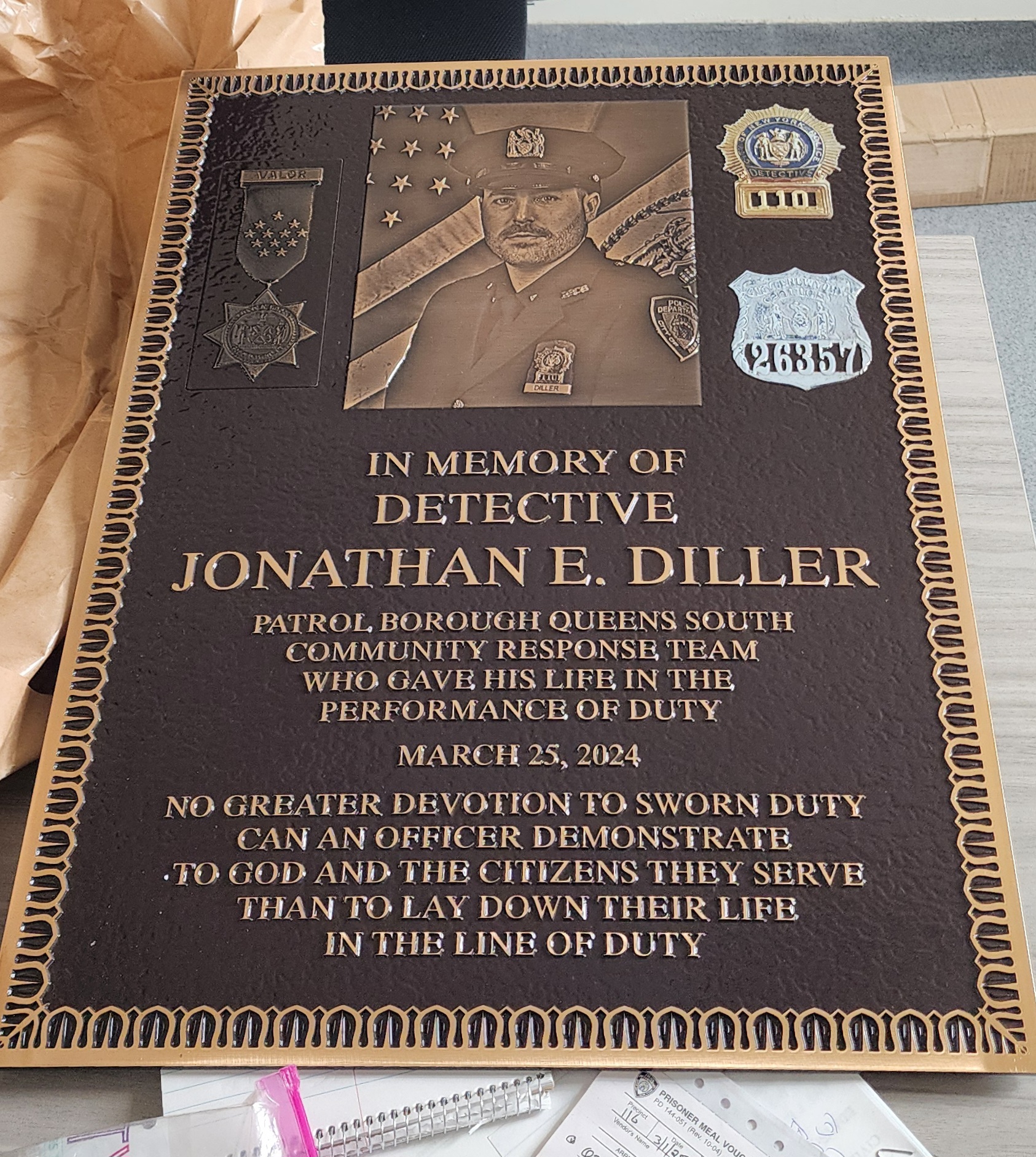 This striking bronze plaque serves as a poignant memorial plaque honoring Detective First Grade Steven D. McDonald. The plaque of a face, expertly engraved, commands the center, respectfully accompanied by his NYPD service medals. This metal plaque powerfully captures the dignity of a hero, the engraved face representing an officer who dedicated 33 years to service despite a severe line-of-duty injury.